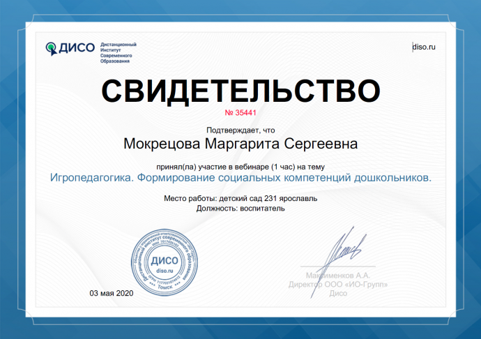 | 5 | Презентация участка для прогулок | Всероссийское издание «Слово педагога» | 21.02.2019 | Соколова И.А. | Сертификат |